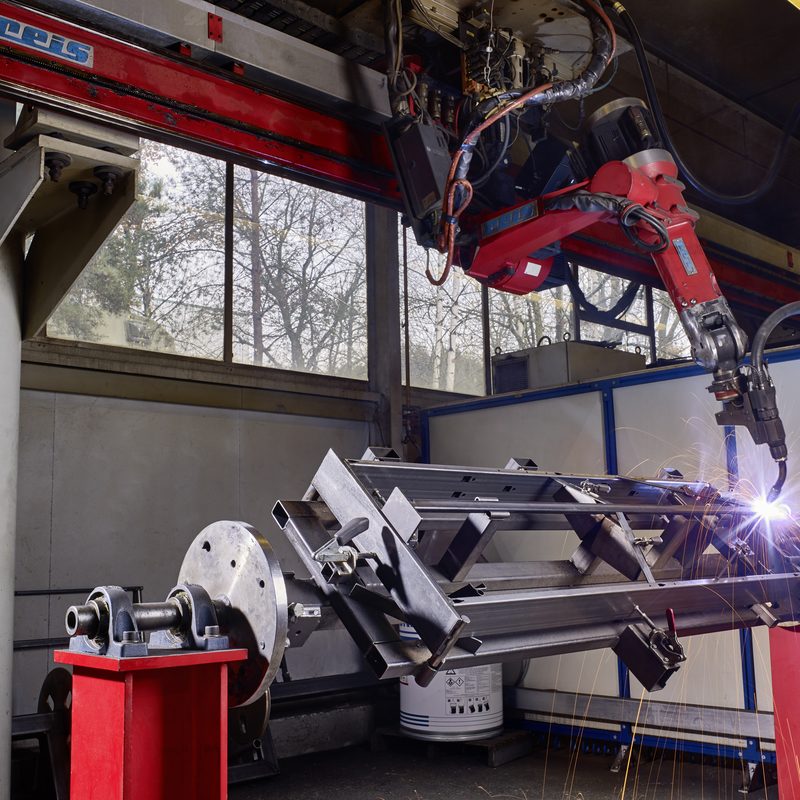 Wir besitzen eines der modernsten Schweißrobotersysteme, den Reis-Roboter SRVL16. Bei diesem Modell handelt es sich um einen kundenspezifischen Sonderbau, der in dieser Form nur 6 Mal in Deutschland gebaut wurde. Der 6-achsige Alleskönner kann Bahnschweißen, Beschichten, Montieren, Handhaben und Bearbeiten, allerdings kommt er bei uns nur zum Schweißen und Plasmaschneiden zum Einsatz. Wir bearbeiten mit dem Schweißroboter Stahl, Edelstahl und Aluminium mit den Verfahren, MIG-Roboterschweißen und MAG-Roboterschweißen.